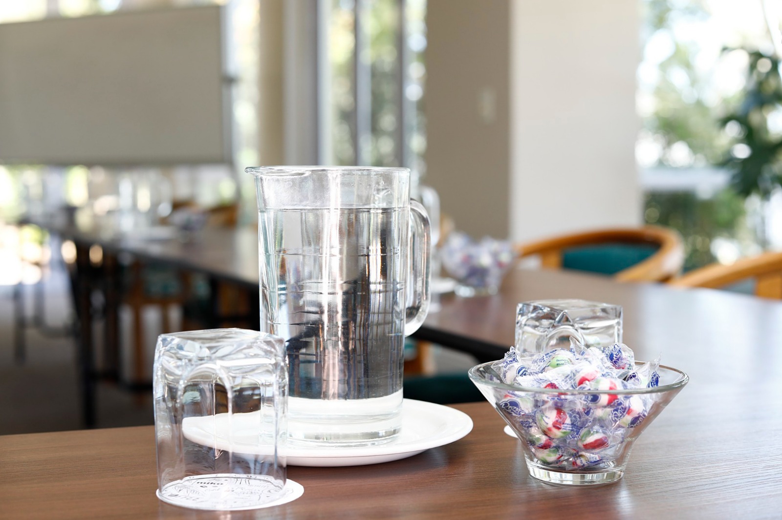 - Bottled mineral water replenished during break times